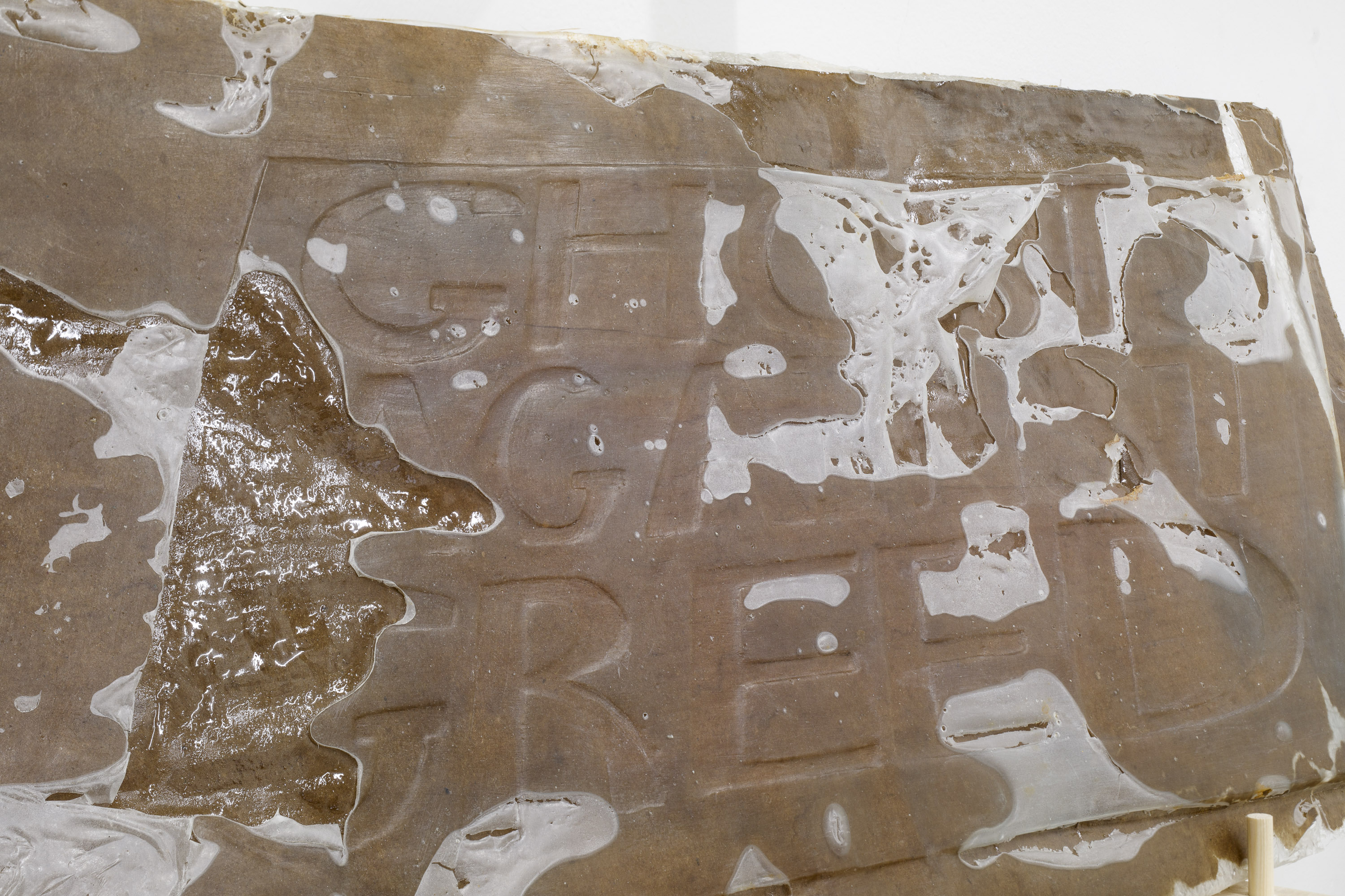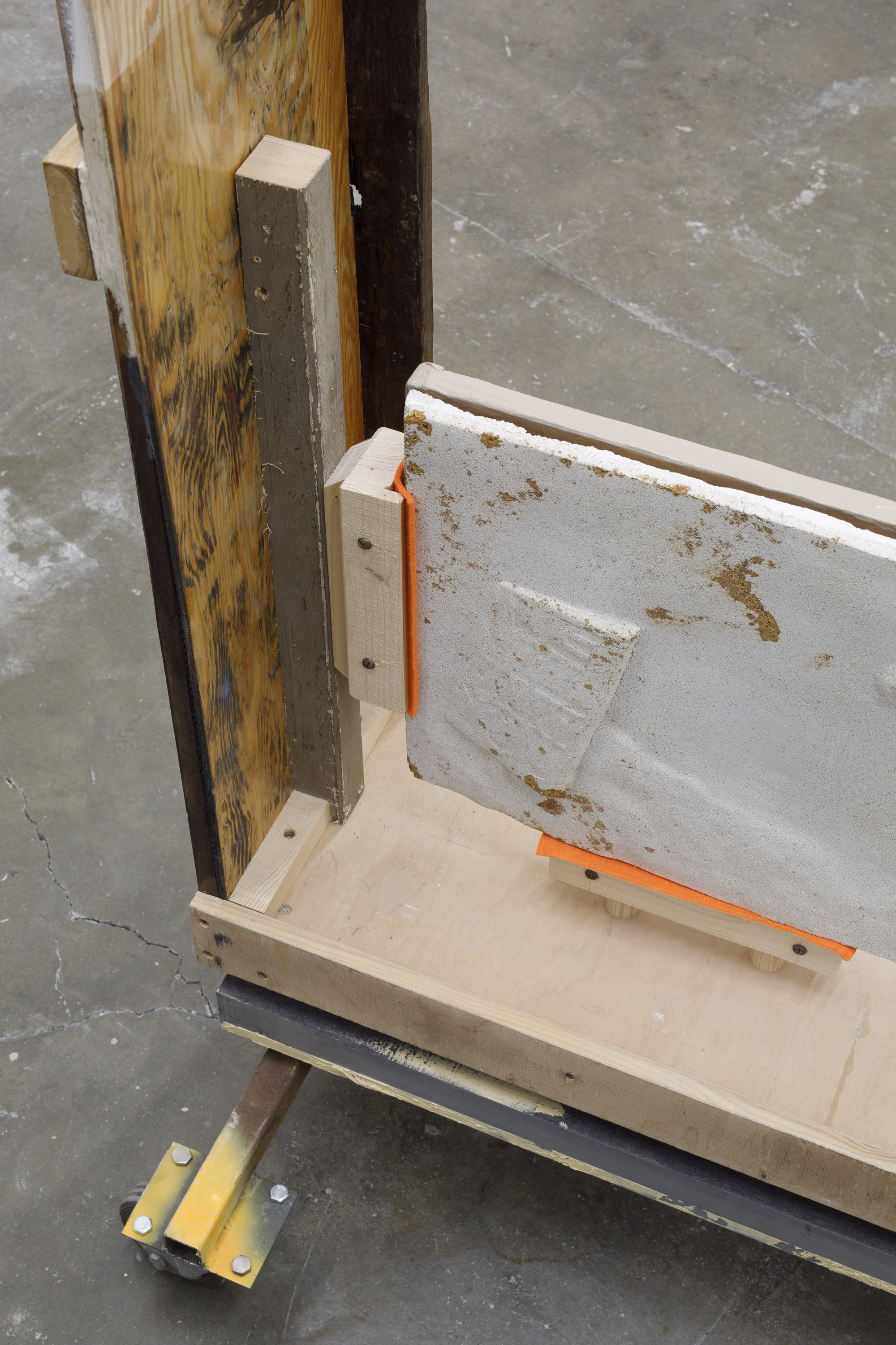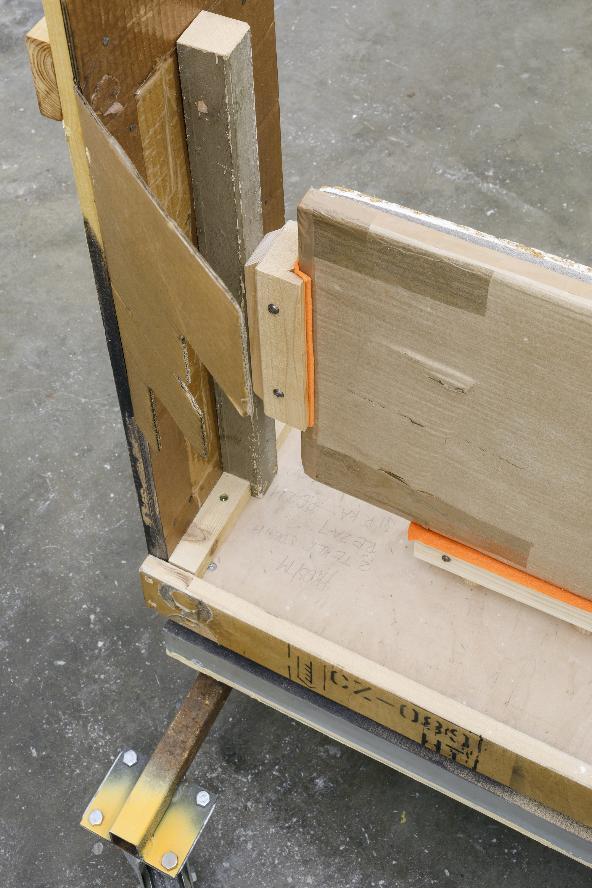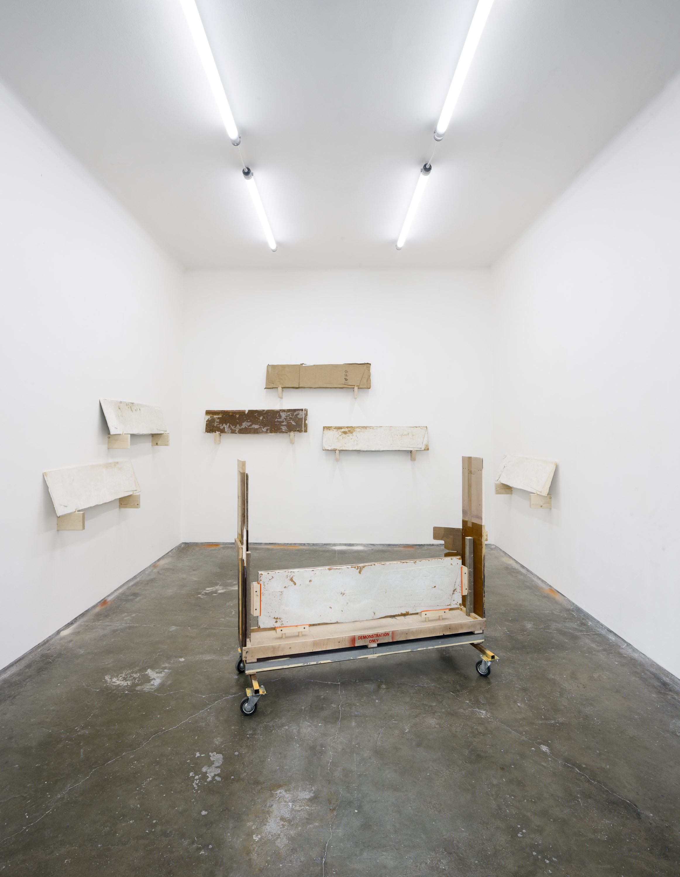 Vojtěch Hlaváček's sculptural installation works with combinatorics in the broadest sense of the word. The deconstructed transport box for artworks, the embedded relief plate and its other variations on the walls demonstrate a twofold reflection: firstly, on the dynamic handling of the material and secondly, on the possible recycling of personal and global contents, of which we are often only observers. The exploration of the relationship between physical matter and lived experience in the urban environment thus naturally straddles the boundary between the abstract and the concrete. This becomes apparent upon first reading the reliefs, in which we find both a semiotic code in the form of language or in the industrial marking of goods, and an alienated human face. The process of repetition, transformation and experimentation is part of the artistic process for Hlaváček.