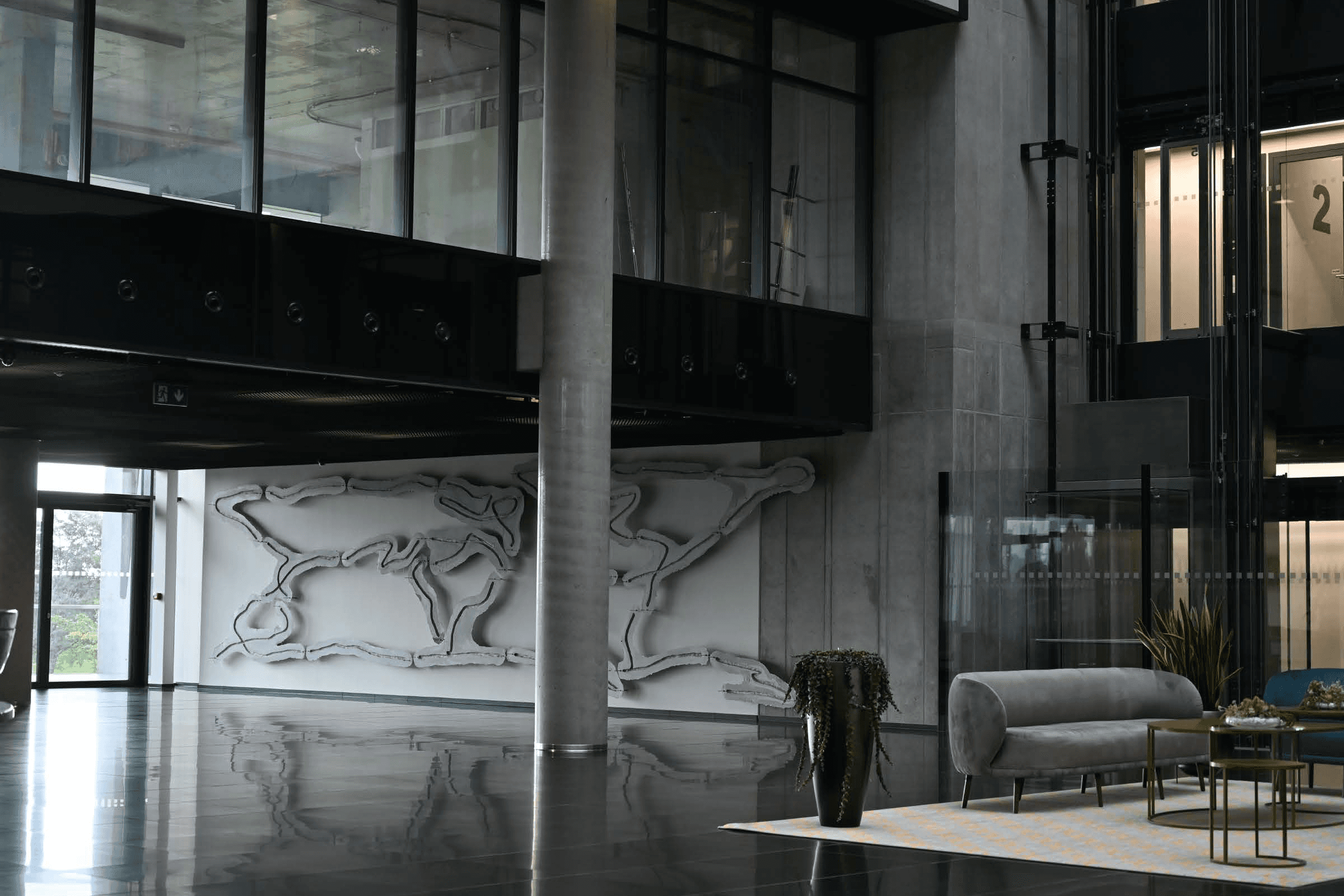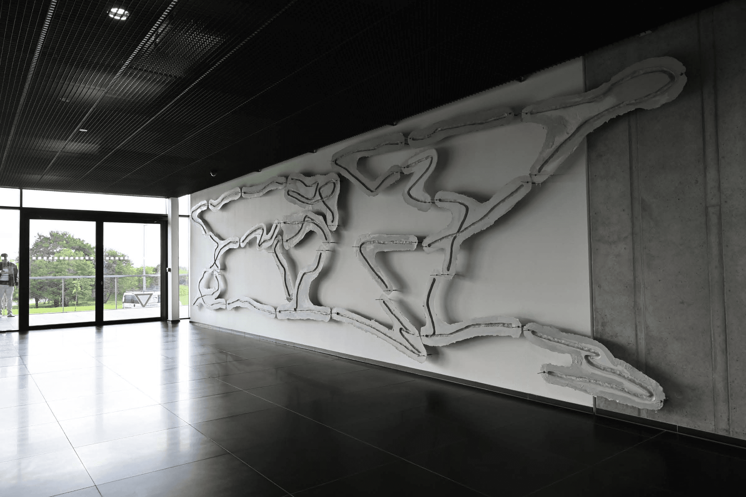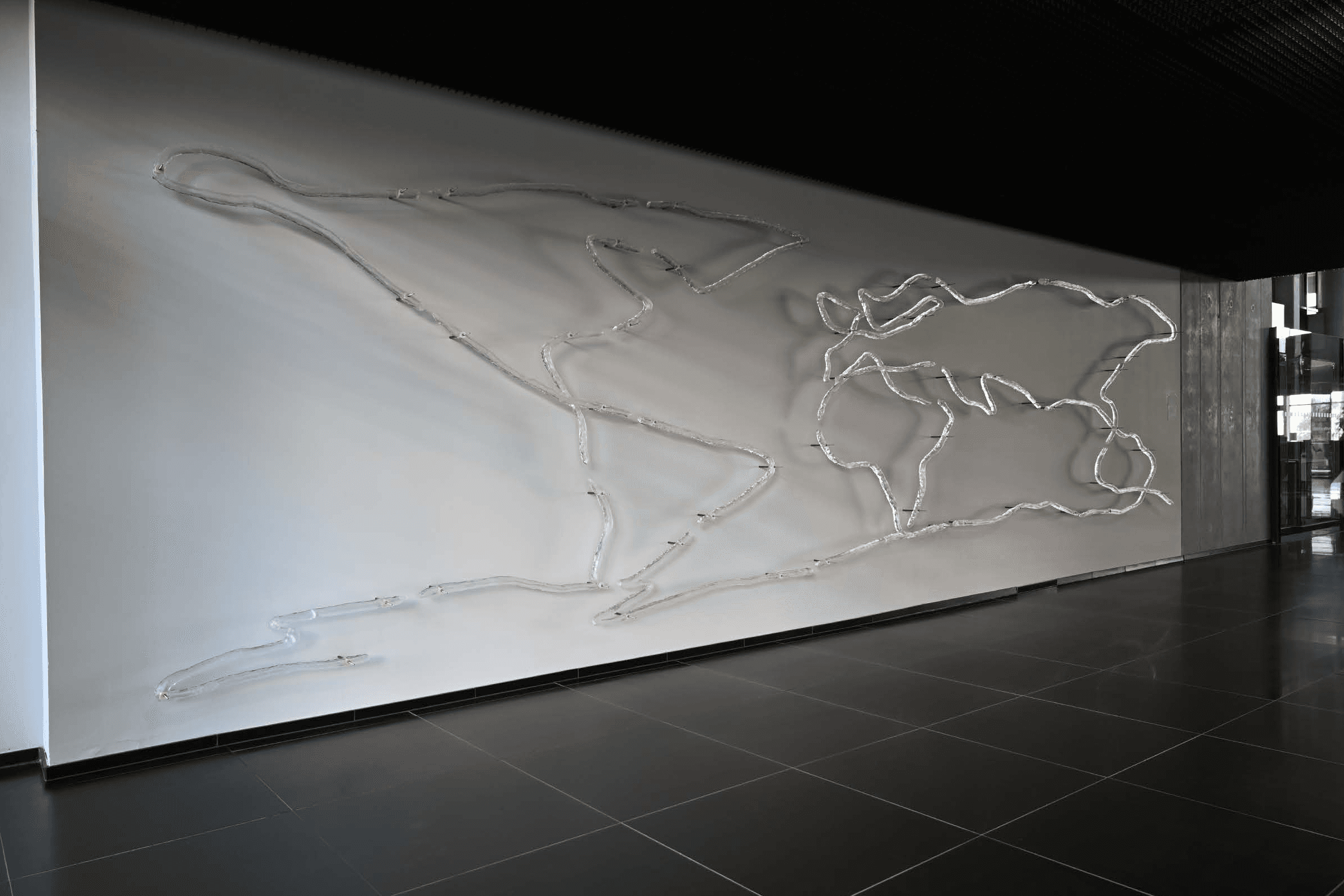 Glass relief located on the west wall has its complementary counterpart placed on the the south wall of the atrium. Southern relief, on the contrary made up of all 18 forms, is cornerstone without which the map on the west wall would never be created.
