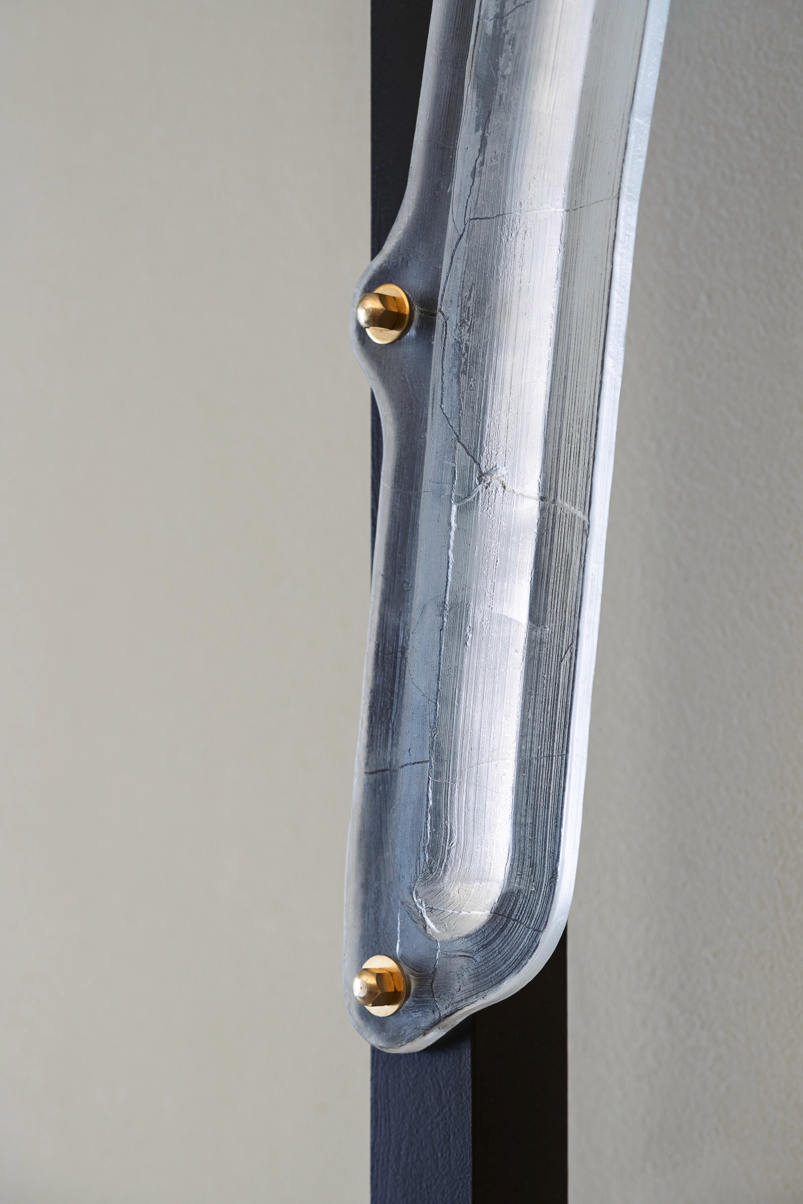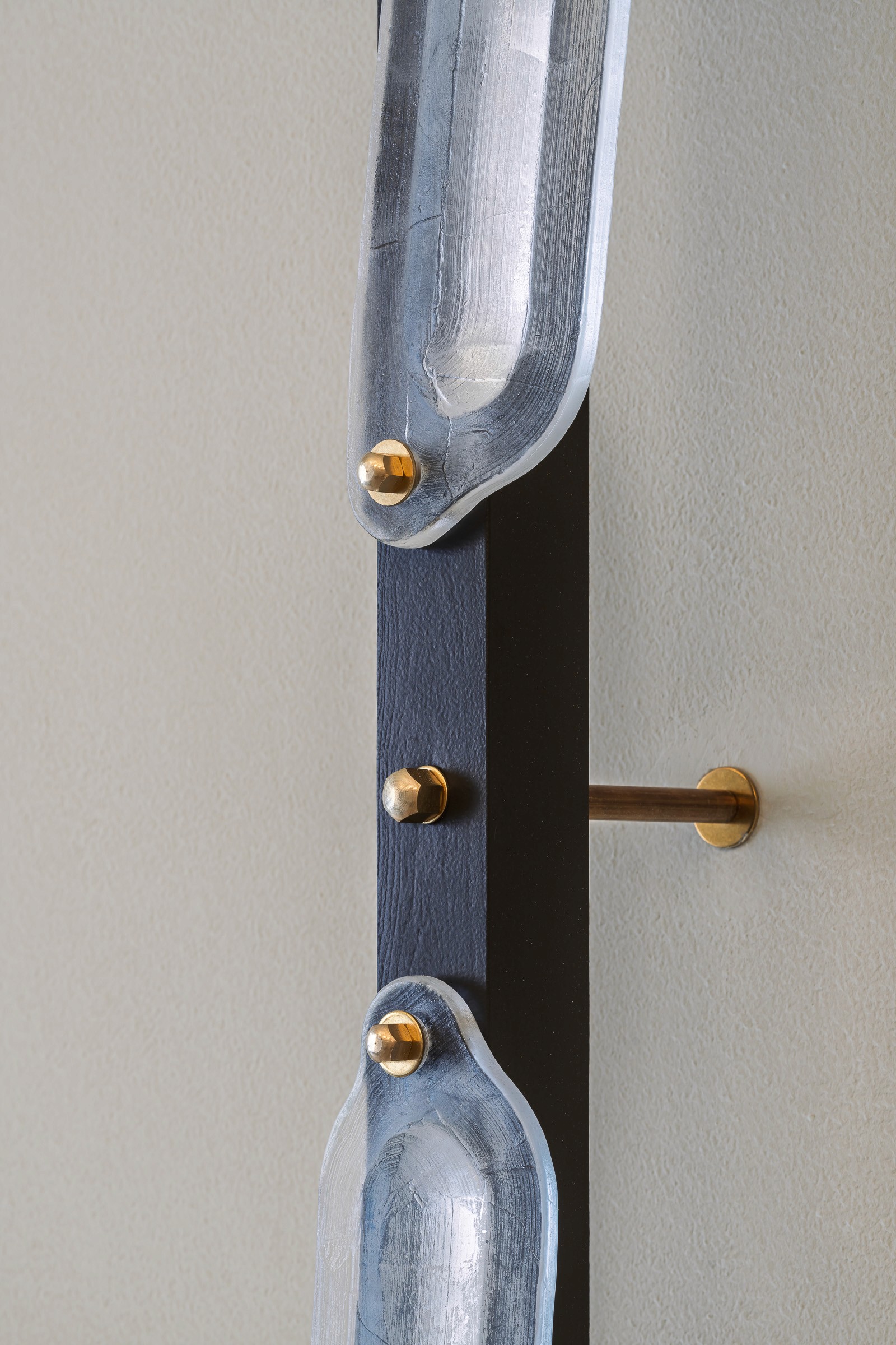 The wall art piece works with the shape of a 14th-century city wall built along the moat that originally ran down Na Příkopě street. This shape is divided into four glass segments, which are partly repeated on wooden frames, inspired by the shape of shop windows. While the glass shapes gradually decrease in number, leading to a single shape that incorporates the position of the 100Yards building, the frames are forming to the complete and clear shape. by the move outside the building, the entire process repeats in the opposite way and decrease into an abstract form.