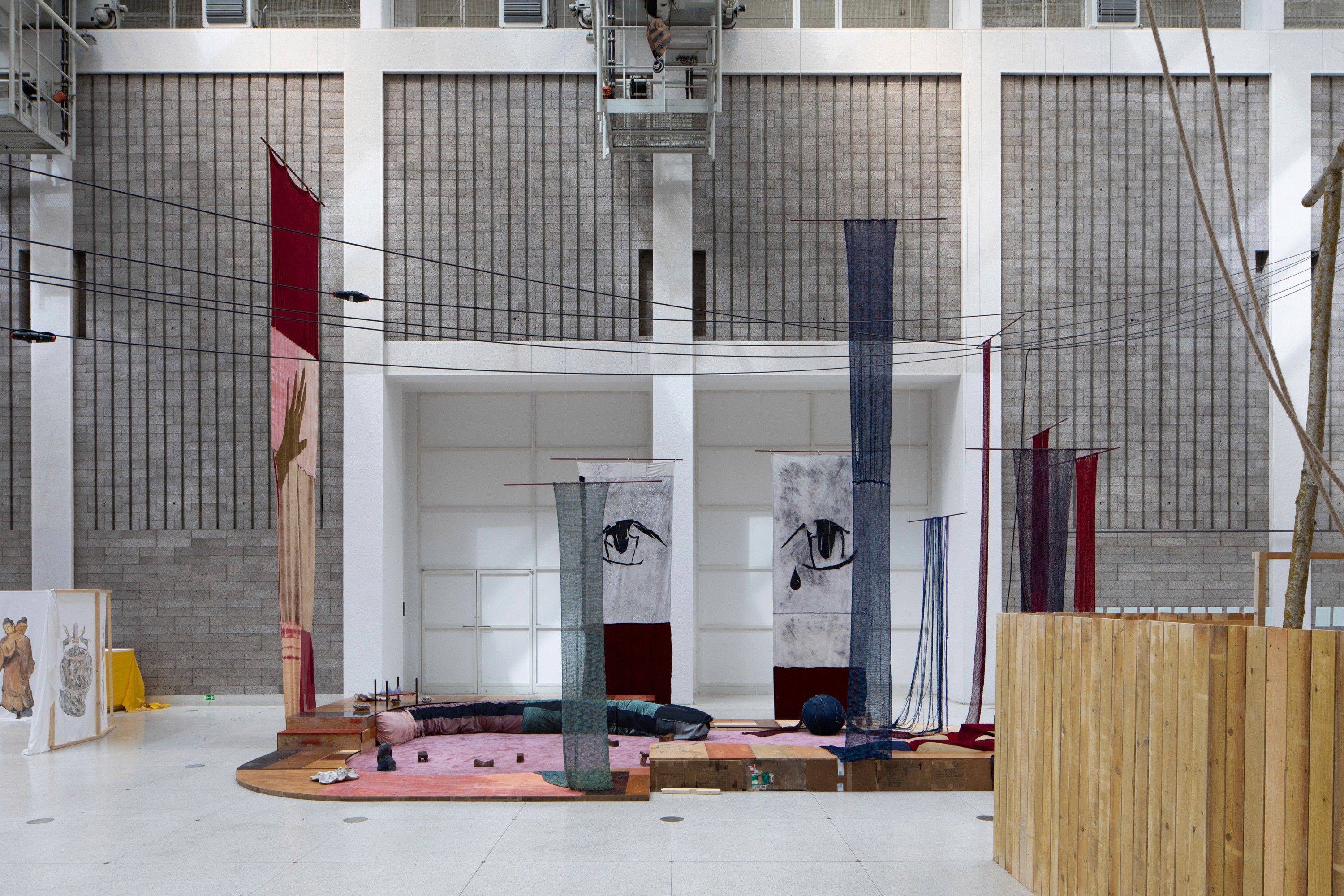The space is further enriched with original textile objects and curtains, creating a pleasant and calming, ideal atmosphere not only for the collective readings, but also for moments of individual reflection and rest during a visit to the Biennale. Serving as a soft anchor point within the exhibition, it offers a kind of safe space — a quiet corner for slowing down, reading, or simply pausing amid the wider experience.