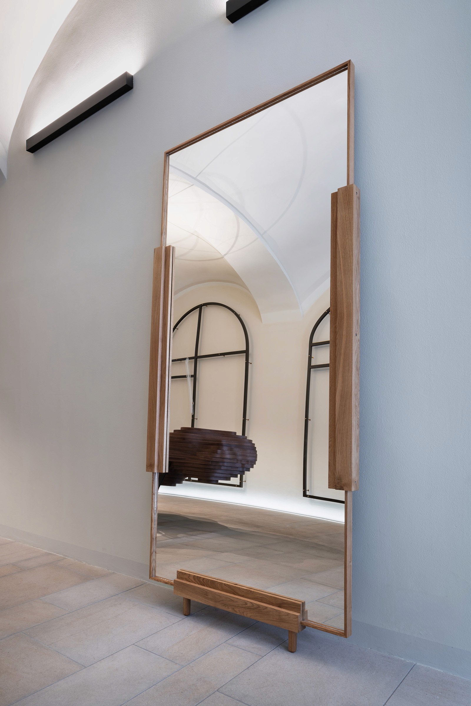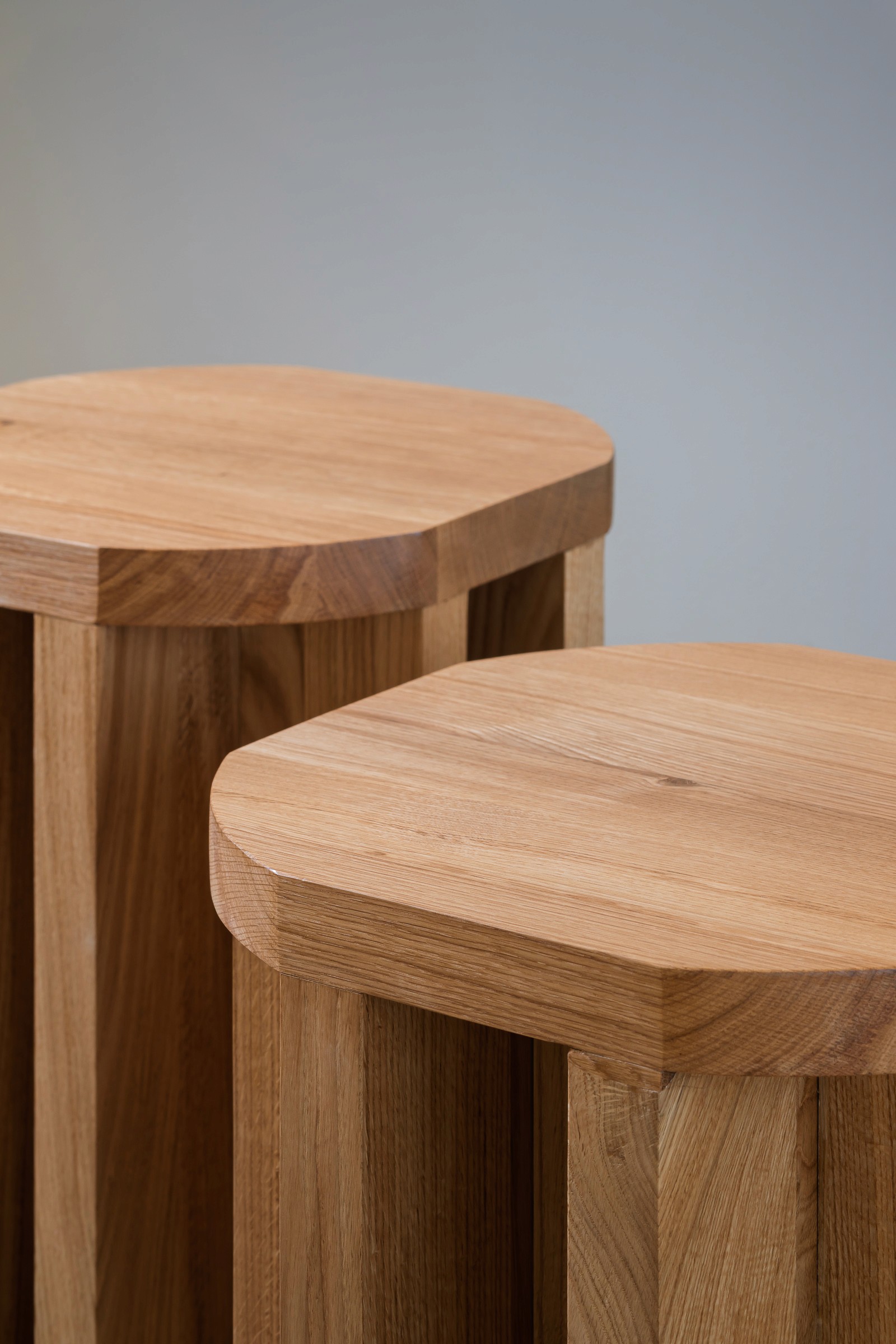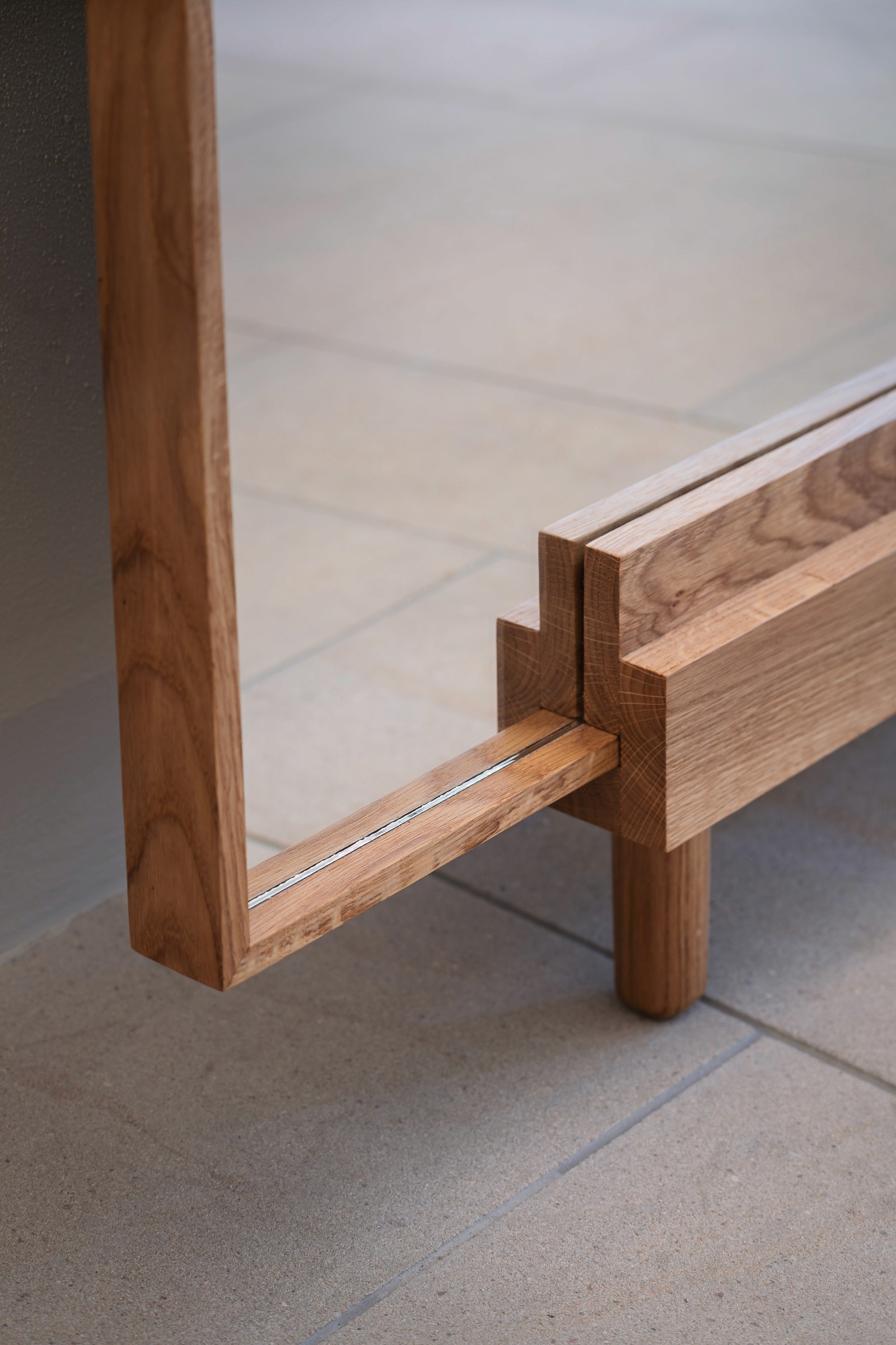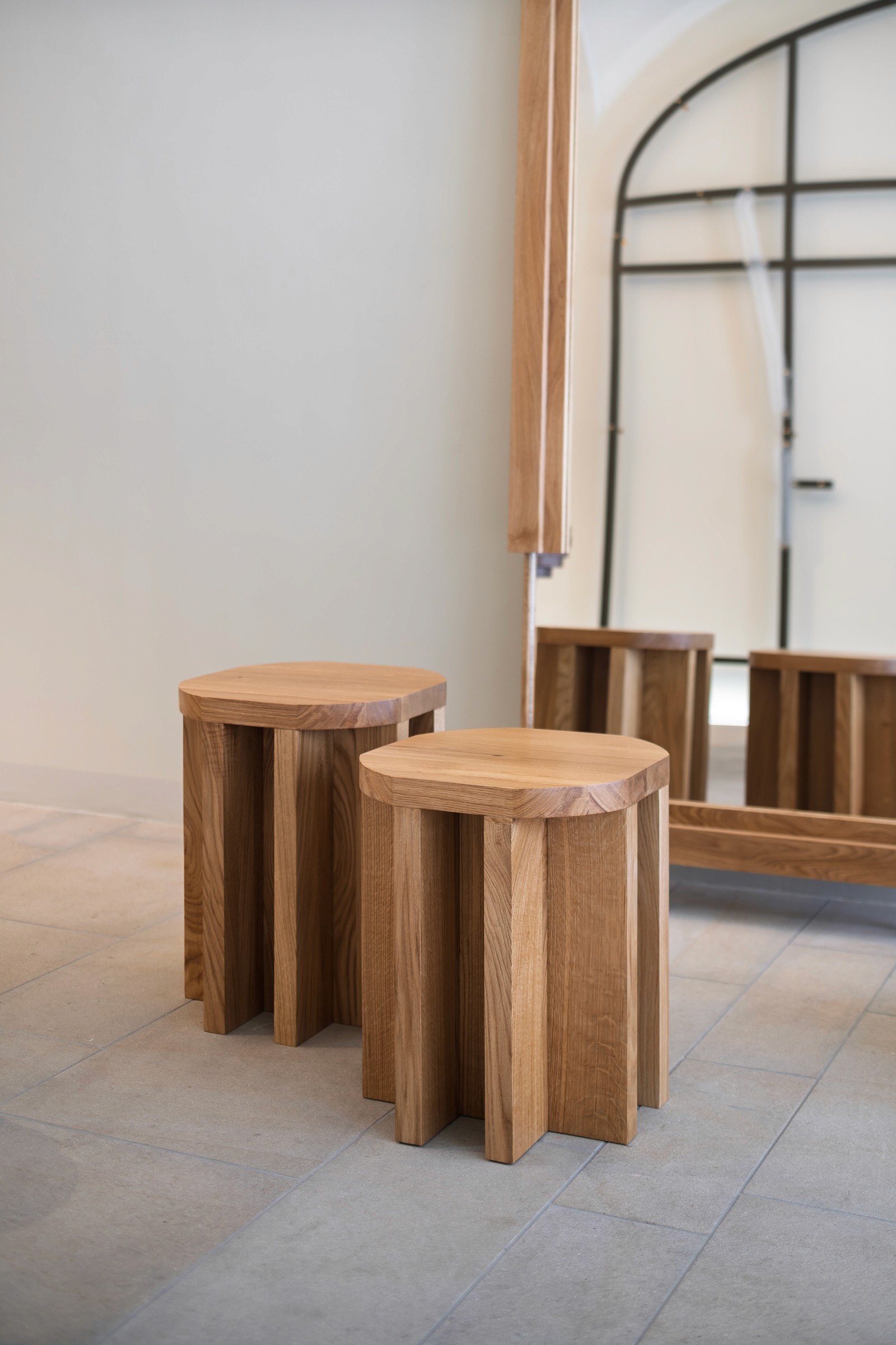 The m.oak 01 collection emphasizes simplicity, elegance and thoughtful detail with a focus on functionality. Together, the mirror and stools form an elegant interplay between solidity and fragility. The massive oak stools offer versatility in use and spatial arrangement thanks to their construction. Their simple geometric base made of solid legs allows for easy interconnection. With three height variations, they can be combined and used as both stools and side tables. This collection also includes a mirror. The raised solid wood frame, featuring a sophisticated construction and a nearly edge-to-edge inset mirror, gives a light and airy impression.